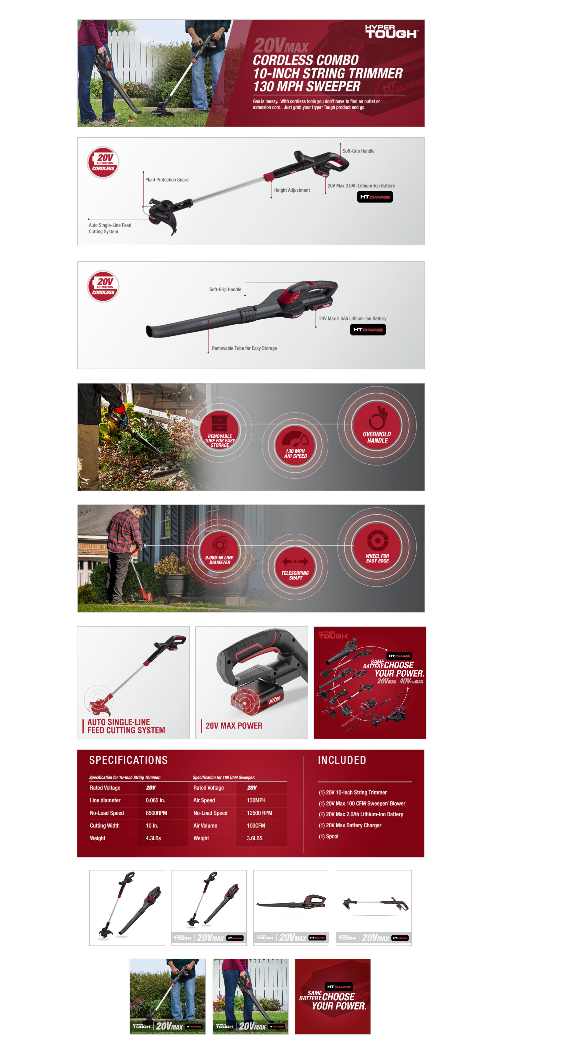 - Versatile Combo: The Hyper Tough 20V Max Cordless Combo Kit includes a 10" string trimmer and a 130 mph sweeper for comprehensive lawn care.